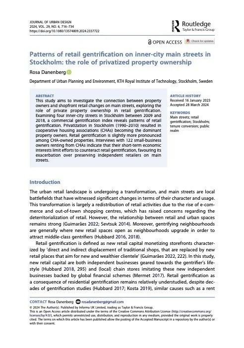 Danenberg, R., 2024. Patterns of retail gentrification on inner-city main streets in Stockholm: the role of privatized property ownership. Journal of Urban Design, 29(6), pp. 716-734.