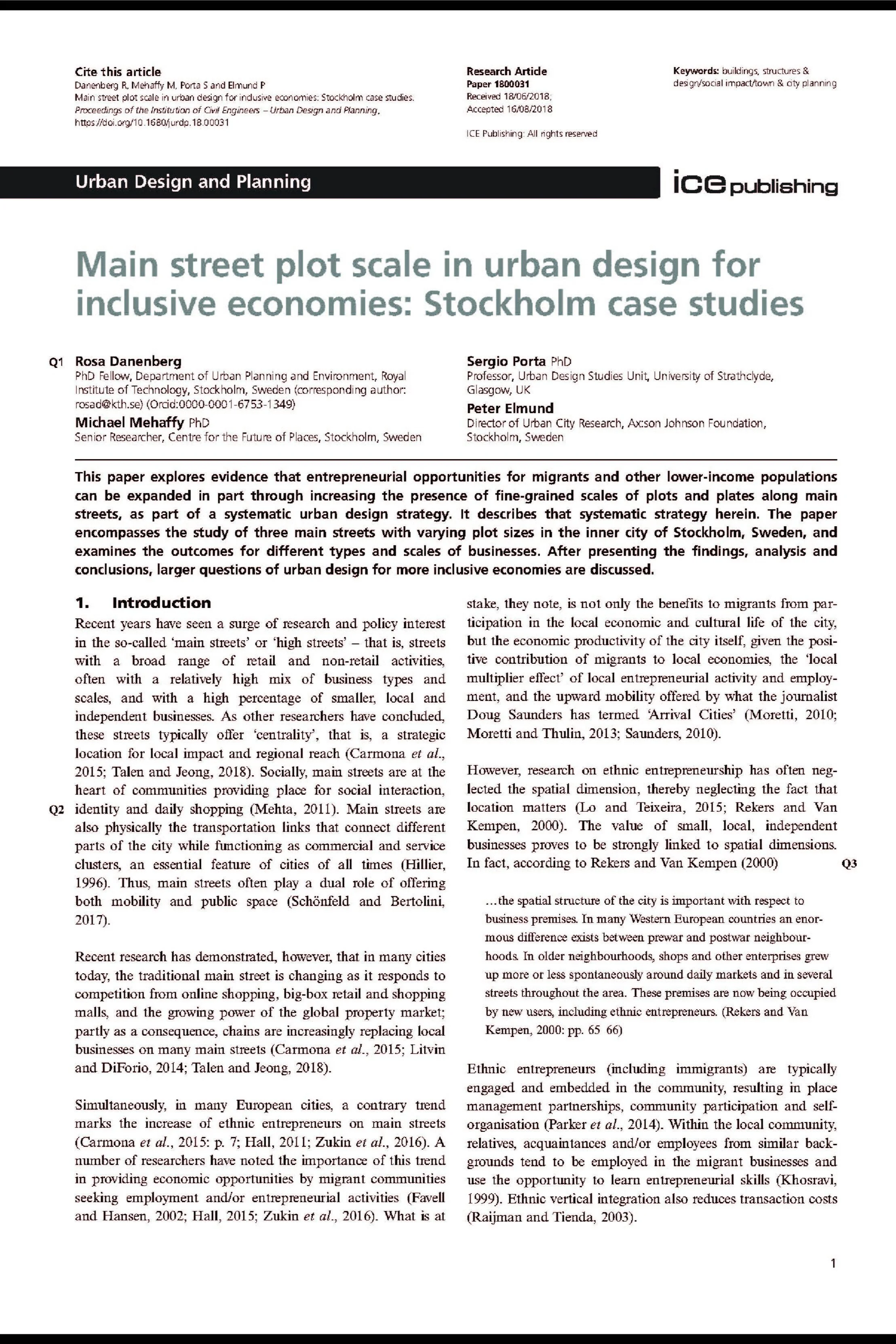Danenberg, R., Mehaffy, M., Porta, S. and Elmlund, P., 2018. Main street plot scale in urban design for inclusive economies: Stockholm case studies. Journal of Urban Design and Planning, 171(6), pp. 258-267.